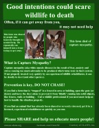 Below are some EXCELLENT pdf flyers for you to download and use for wildlife conflicts. They are produced by CLAWS Inc., a wildlife rehab nonprofit in NC (http://www.nc-claws.org) and we have permission to use these, but all copyrights belong to CLAWS Inc.